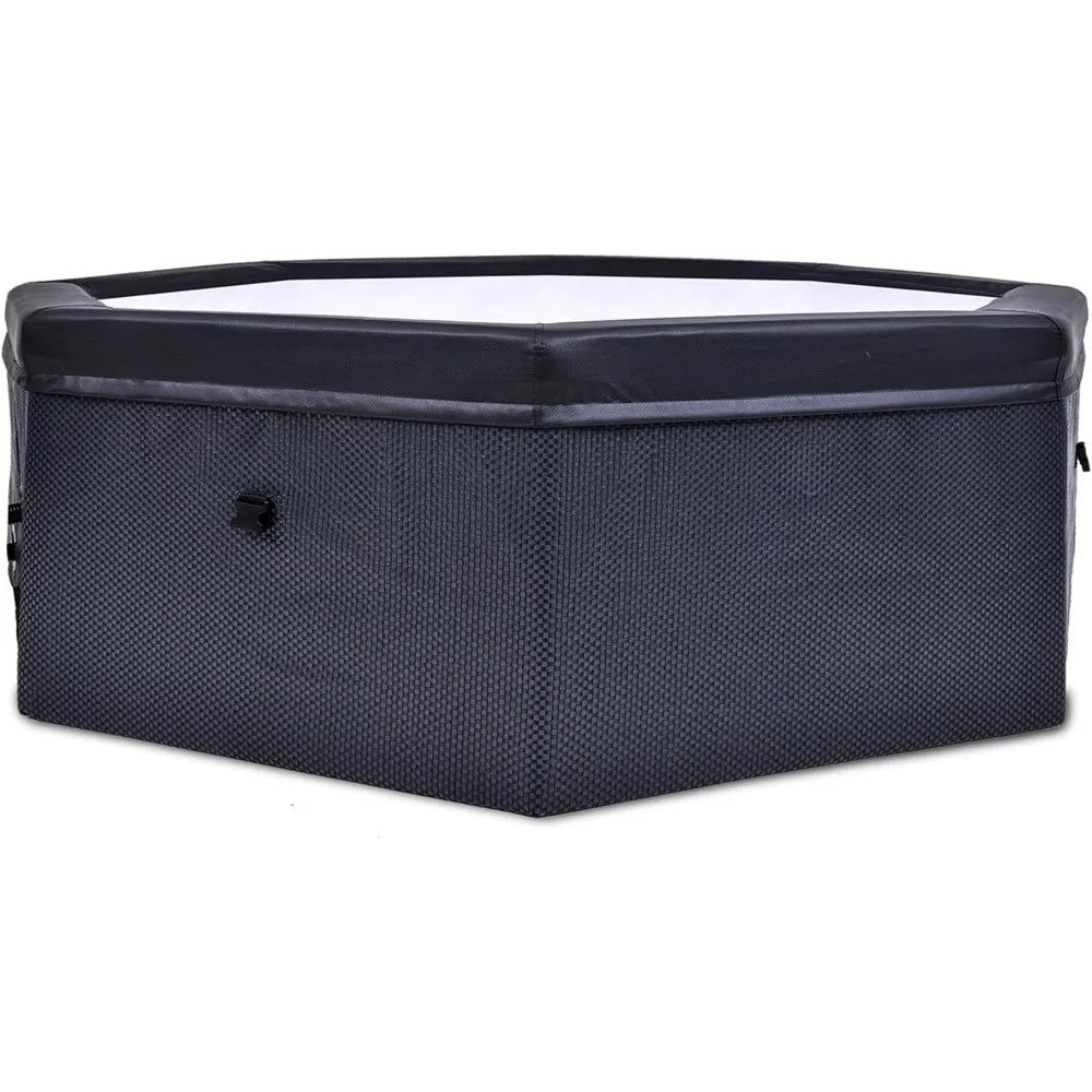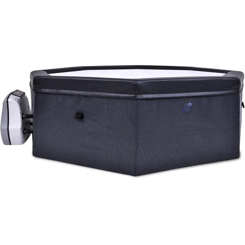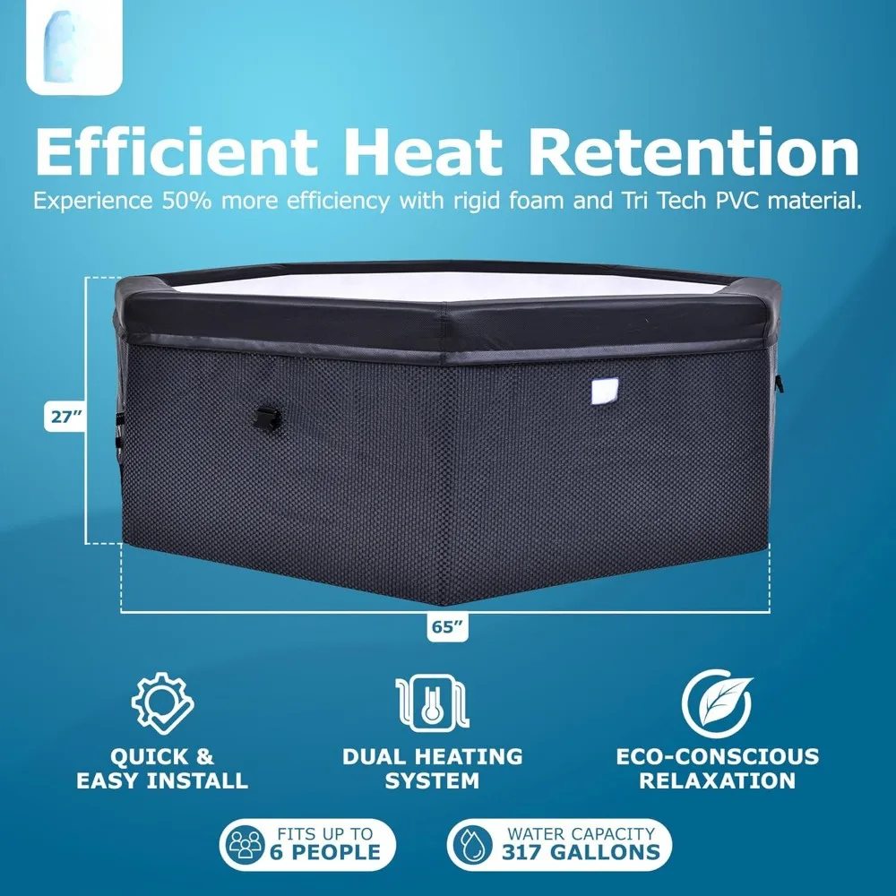 - Especificaciones de la bañera: la bañera de hidromasaje inflable mide 65 x 65 x 27 pulgadas (largo x ancho x alto) con una capacidad máxima de agua de 317 galones, que es un gran tamaño para adaptarse a hasta 6 adultos a la vez